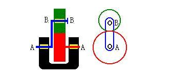 行星齒輪,它們的轉(zhuǎn)動(dòng)軸線是不固定的,而是安裝在一個(gè)可以轉(zhuǎn)動(dòng)的支架(藍(lán)色)上(圖中黑色部分是殼體,黃色表示軸承)。行星齒輪(綠色)除了能像定軸齒輪那樣圍繞著自己的轉(zhuǎn)動(dòng)軸(B-B)轉(zhuǎn)動(dòng)之外,它們的轉(zhuǎn)動(dòng)軸還隨著藍(lán)色的支架(稱(chēng)為行星架)繞其它齒輪的軸線(A-A)轉(zhuǎn)動(dòng)。繞自己軸線的轉(zhuǎn)動(dòng)稱(chēng)為“自轉(zhuǎn)”,繞其它齒輪軸線的轉(zhuǎn)動(dòng)稱(chēng)為"公轉(zhuǎn)",就象太陽(yáng)系中的行星那樣,因此得名。